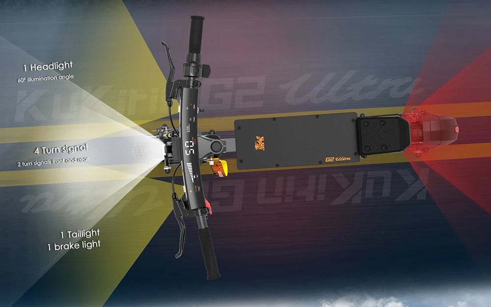 Sistemul de iluminare complet LED include un far frontal alimentat la 48V / 10W, cu un unghi de iluminare de 60° si o suprafata iluminata de aproximativ 5 metri patrati. Semnalizarile sunt incluse, iar stopul spate ramane aprins atunci cand farurile sunt pornite si clipeste automat in timpul franarii.