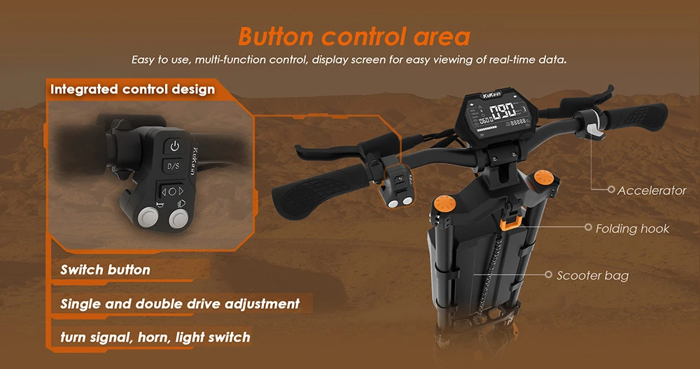 Afisajul inteligent multifunctional integreaza mai multe functii, inclusiv afisarea vitezei, indicatorul bateriei, diagnosticarea defectiunilor, inregistrarea kilometrajului etc. Accepta o varietate de setari personalizate, cum ar fi reglarea luminozitatii luminii de fundal, reglarea modului de pornire etc., pentru a indeplini obiceiurile de utilizare si nevoile diferitilor soferi.