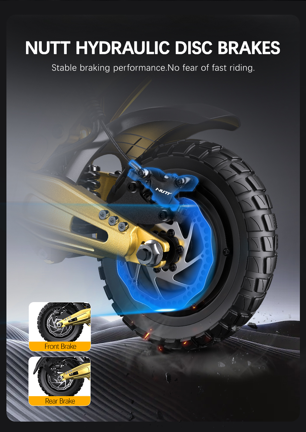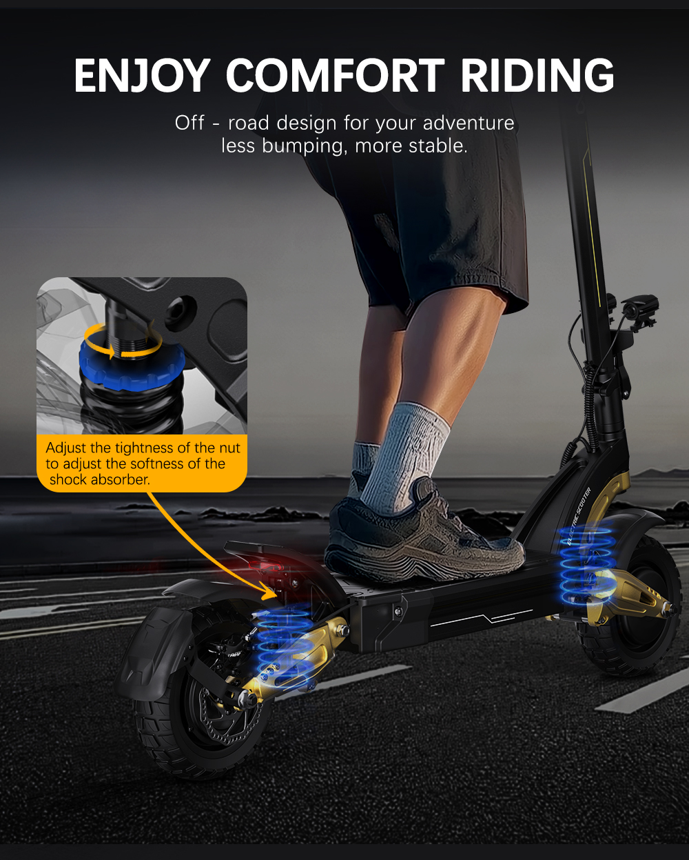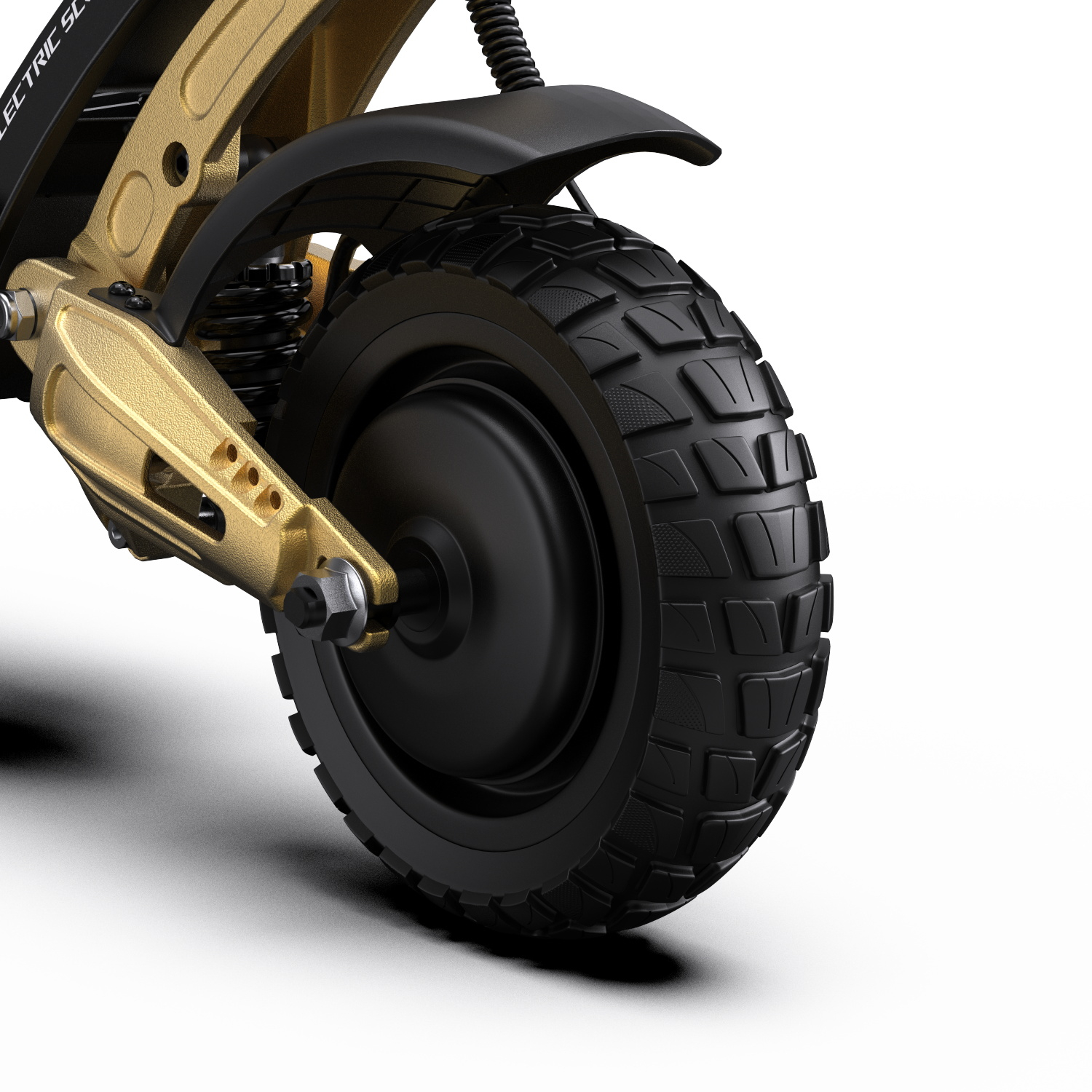 Vine cu roti de 10" si anvelope tubeless All Terrain ceea ce ajuta foarte mult aderenta in momentul in care te aventurezi in padure sau pe drumuri ne asfaltate unde cu ajutorul suspesiei duble
