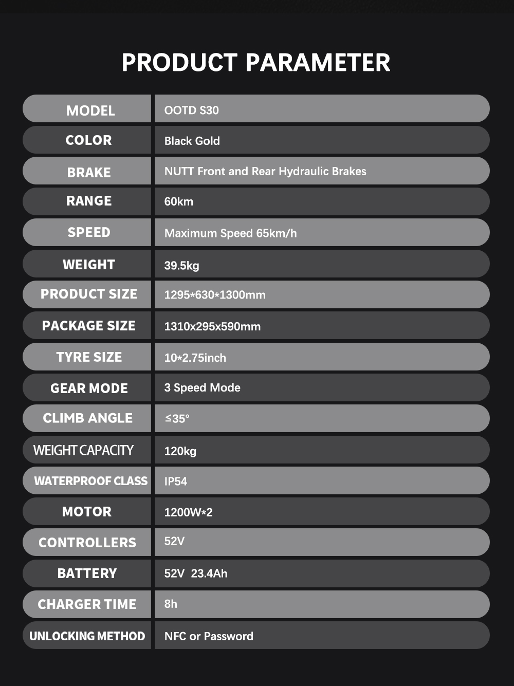Cu o baterie de 52V si 23.4Ah care se incarca full in aproximativ 8 ore, autonomia trotinetei OOTD S30 ajunge la 60 de km in conditii ideale.